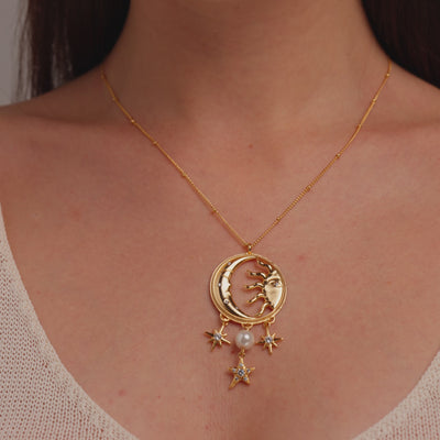 Two energies, one force. This pendant necklace blends sun and moon—your light and shadow—in perfect cosmic balance.